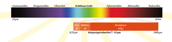 Ferninfrarotstrahlung - die Kraft der Sonne! Die wohltuende Wärme auf der Haut, sobald man in der Sonne steht: Ferninfrarotstrahlen erzeugen eine äußerst wohltuende Wirkung auf unseren Körper. Das Entscheidende für die Wirkung dieser Wärmestrahlen ist, dass sie exakt der Wärmestrahlung des menschlichen Körpers entsprechen, die ebenfalls eine Wellenfrequenz von 7-15 µm besitzt.